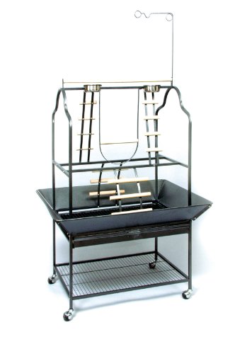 Prevue Pet Products Parrot Playstand includes hooks for hanging multiple toys and treats, along with different sized stairs and ladders for plenty of space to climb. Double cups provide room for food, water or treats, and the easy-rolling caster stand lets you easily move the playstand from room to room or indoors to outdoors. A pull-out drawer, along with the rounded corner seed guard, make cleaning quick and easy, while the bottom storage shelf is perfect for keeping extra food, treats, toys and cleaning supplies. Our Parrot Playstand is available in a non-toxic, powder-coated, black hammertone finish and measures 30-inch long, 22-inch wide and 73-1/2-inch high to the top of the toy hook.